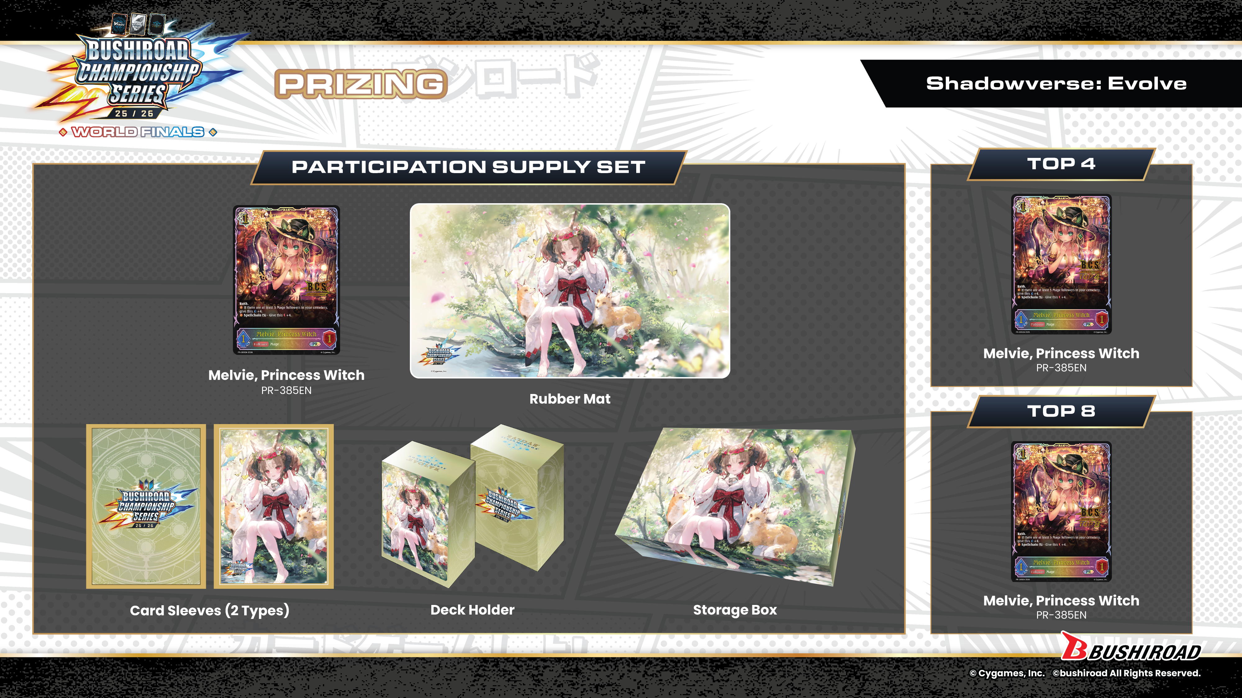 All World Finalists will receive a Sekka-themed supply set that includes a storage box, playmat, deckbox, and sleeves; as well as a Super Legendary promo version of Melvie, Princess Witch.