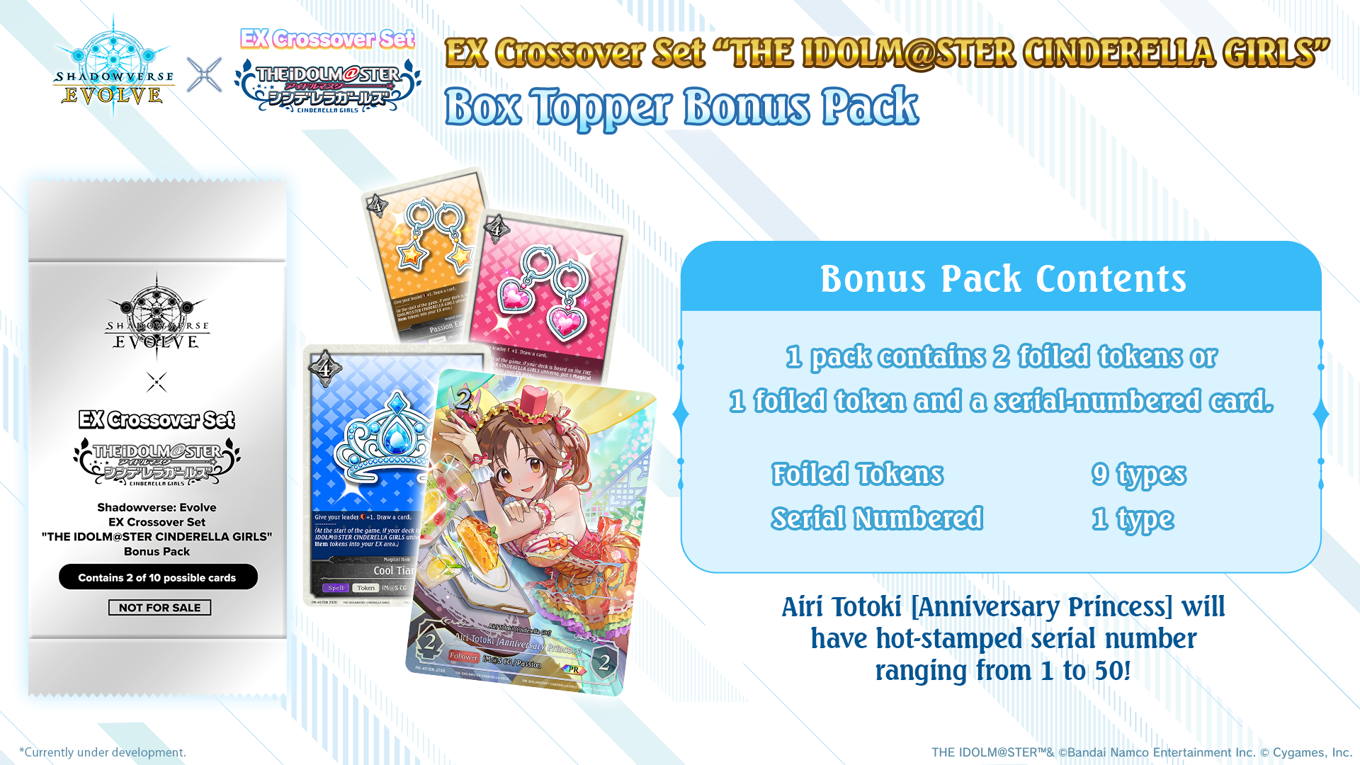 Your next shining stage begins now! To commemorate the launch of EX Crossover Set "THE IDOLM@STER CINDERELLA GIRLS", official Bushiroad stores will be holding special tournaments using only cards from the "THE IDOLM@STER CINDERELLA GIRLS" universe from April 24, 2026 – May 24, 2026. More event details can be found here.