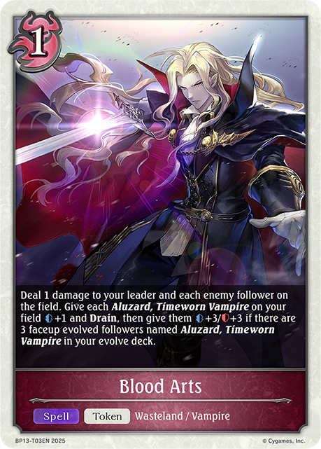 Evolve Aluzard, Timeworn Vampire and tap on its Last Words ability to add Blood Arts in the EX area. Summon Sanguine Necklace and prepare to deplete your leader's health!
